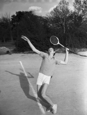 Tennis. Warren McMillan, City High school Singles champ. He's seen to be in action as he is holding the racquet about to hit the ball.