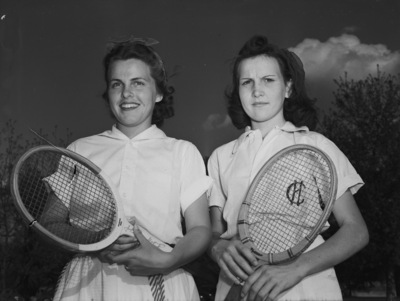 Tennis. Here are the newly crowned girls' high school double champions of the city. They are, left to right, Olive Rall and Betty Heard of Paschal High School. They will compete in the district tournament at Texas Christian University (TCU).