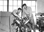 James D. Bates and W. S. Brown. The two men are shown inspecting a large engine. Bates is slightly bent over and pointing out something with his pen while Brown looks on. The duo is dressed in trousers and long-sleeve, button down shirts. Behind them is a wall of tiled windows.