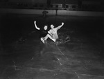The ice skating rink at Will Rogers Memorial Coliseum is opening early for the fall season. Testing out the ice, left to right, are Mary Louis Ballard and Bert Beebe. They are shown taking the first spill of the season. Miss Ballard is wearing a dark dress and ice skates. Mr. Beebe is a Technician 5th Grade with the 18th Machine Records Unit. He is a native of Glendale, Long Island, New York. He is dressed in a military uniform.
