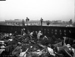 Scrap Metal Salvage Campaign. Workmen loading scrap metal. Standing on the cars (left to right) are A. B. Woods, Lee Sims and Max Walinsky.