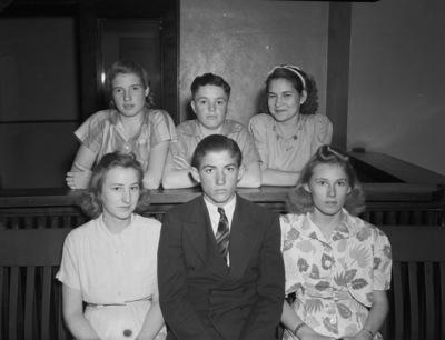 Grapevine High School play cast which won first place recently in the Tarrant County Interscholastic League one-act play contest in the Texas Christian University (TCU) auditorium. Front, left to right, Vivian Smith, Joe Ferguson and Maxine Starr. Back row, left to right, Delores Oxford, Harold Sharp and Eunice Lester. The prize winning play was "Bread" by Fred Eastman.