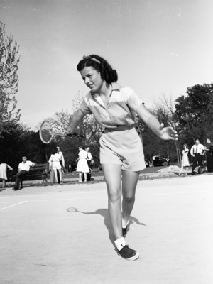 Mary Jane Bullington, tennis player in action shot. Her outfit is a collared shirt and shorts. (no clipping)