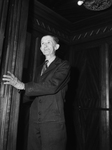 J. P. Greene, retired farmer, running an elevator. Greene is shown smiling widely as he looks out of an elevator he is working from. He is dresses in a dark suit and wears a pair of gloves, as well. He appears to be holding the elevator door open. He is 63 years old.