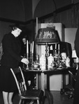The Woman's Club of Fort Worth holds it's second antique show at the Anna Shelton Hall. Attendee, Mrs. James C. Wilson is looking at a display of candlesticks, teapots and other containers at the opening session, Monday, October 26. Mrs. Wilson is shown standing in front of a table that has a lamp. She appears to be grabbing one of the candlesticks. She is wearing a dark jacket and skirt with a small-brimmed hat. There is also a wooden chair near the table, by Mrs. Wilson. Published in the Fort Worth Star-Telegram evening edition, October 27, 1942.