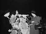 The Woman's Club of Fort Worth holds it's second antique show at the Anna Shelton Hall. Attendees (left to right) Mrs. Houston Bolin, Mrs. L. H. Cullum, and Mrs. E. B. Clark, all of Wichita Falls, Texas are enjoying the collection of antique dolls displayed during the opening session, Monday, October 26. Mrs. Cullum and Mrs. Clark both inspect a doll while Mrs. Bolin looks on. Mrs. Bolin is wearing a dark jacket, purse and hat; Mrs. Cullum also wears a dark hat and Mrs. Clark wears a buttoned up jacket with a skirt and purse. The dolls vary in size but are all in ballgown dresses. Published in the Fort Worth Star-Telegram evening edition, October 27, 1942.