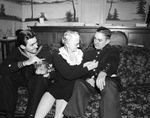 Navy Day at Navy Mothers Clubroom. Coast Guardsman Wesley Norman, left, watching Mrs. R. L. Peck sew a button on the blouse of Corporal J. G. Brockrath, a Marine.