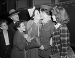 Technical Sergeant Rob Roy McDaniel, being kissed by his mother, Mrs. H. C. McDaniel. Others, left to right, are Barbara Jean, sister; his father, H. C. McDaniel; younger brother, Dean, and at the extreme right is sister, Elizabeth Ann.
