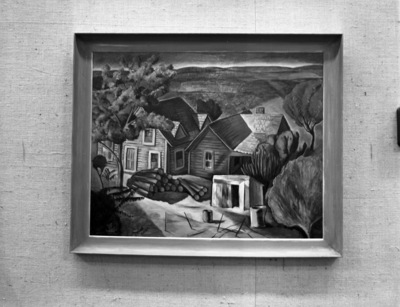 "Farm at Early Morning," an oil painting by Frank Fisher, which was the winner of the $100 prize awarded in the second annual local artists show sponsored by the Fort Worth Art Association. Fisher's prize was for the best work of art in the show. The framed painting is hanging on a wall and depicts several farm houses and trees. Second award of $25 went to Veronica Helfensteller for her water color, "K. of C. General Store." Third prize was awarded to Blanche McVeigh for her aquatint, "Insurnace Man," and the fourth prize was awarded to Dorcas Howard for her oil painting, "Quality Grove." These paintings will be on view in the gallery of the Fort Worth Public Library.