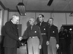 Congressman Fritz Lanham being greeted by Fort Worth Quartermaster Depot officers. They are left to right, Captain Artenus H. Hemphill, slaking hands with Lanham; Captain Glen S. Bixby and Captain Manion F. Jones.