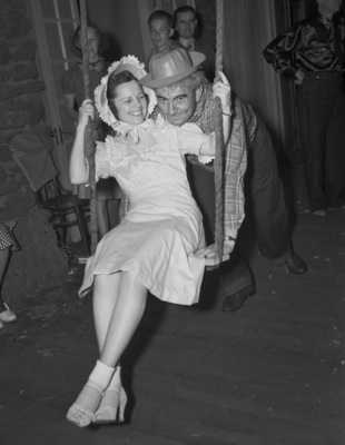 Mr. and Mrs. J. Waylan Derr, are pictured in costumes which they wore to the Glen Garden Country Club barn dance. Mrs. Derr is seen to be sitting on the swing and Mr. Derr is standing behind her wearing a hat.