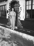 Mrs. Claude L. Bush, standing in front of her home, a former filling station.Mrs. Bush is wearing a pair of trousers and a half-sleeve, collared blouse. She is also holding a couple of books in her right hand as she looks forward. Behind her, her front door can be seen with bricks serving as its frame. On either side of the door are large windows.