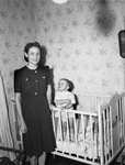 Mrs. O. K. Montgomery and daughter, Beverly Kay. Mrs. Montgomery is shown standing next to her daughter's crib while her young daughter stands inside the crib and looks up at her mother. Mrs. Montgomery is wearing a short-sleeve dark dress with a belt and buttons that lead up to her collar. Her daughter is wearing a small dotted dress. Mrs. Montgomery is looking on at the camera and smiling widely.