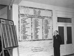 Rabbi Philip Graubart is standing beside a tribute to some of the men that served in World War I. The names on the honor roll belong to members of the Congregation Ahavath Sholom. The honor roll on the left contains the 112 names of those serving in World War II. The latter was dedicated on November 13, 1942. Text written beneath the World War I honor roll indicates the tribute was erected by The Ladies Auxiliary on November 11, 1920. Rabbi Graubart is dressed in a double breasted suit.