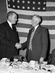 W. M. Eagle is welcoming Kelt Wilson into the Riverside Civic League as the newest member. "The newest member of the Riverside Civic League, Kelt Wilson, left, is welcomes into the organization by W. M. Eagle, a charter member who now lives in Dallas but who has always maintained membership. Wilson, now of Birdville, is moving into the district next week and was welcomed at the tenth annual banquet held Thursday night at the Blackstone Hotel." Both of the men are looking each other in the eye; Mr. Wilson has a relaxed smile while Mr. Eagle is more discerning. Mr. Eagle is wearing a medium-toned suit with notched lapels, a light-colored vest, a white button-down shirt, and a dark colored-tie. Mr. Wilson is wearing a dark colored suit with four-button cuffs, a white button-down shirt, and a dark geometric-print tie. An American flag is hanging on the wall behind them. In the foreground stands a covered dining table, with some silverware, glasses of water, teacups with sauces, and plates lying on top. The plates have what appear to be biscuits and dishes for cream.