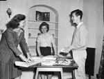 The Mollison children are getting into the Christmas spirit by wrapping presents for their parents, Brigadier General and Mrs. James A. Mollison. Pictured left to right are Molly, Betsy, and Douglas Mollison. Molly is wearing a collated blouse, blazer, and a matching skirt. Betsy is dressed in a button-up blouse and a skirt. Douglas is wearing a collared shirt, sweater, and trousers. They are standing around a table on which there are various wrapping papers and materials.