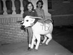 Texas Christian University (T. C. U.). Nancy, left, and Jane Dunkle of Marfa, holding a toy Texas Longhorn.