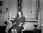 Mrs. Howard Jones. Mrs. Jones is shown sitting in a chair wearing a long-sleeve, dark dress, smiling and looking to her right. Behind her is a bed and windows covered by curtains on the back wall. She is a new citizen in Fort Worth, Texas and a bride of four months. Her husband is a tool dispatcher.