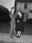 Private Phillip T. Card married Miss Doris Smith Thursday afternoon, November 12, 1942. The wedding almost didn't happen when the groom missed his bus to Fort Worth, Texas. Private Card is stationed at Sheppard Field. He is shown standing on the front lawn, telling his bride the story. He is dressed in his military uniform. Mrs. Card is wearing a hat, coat, and a fur shawl.