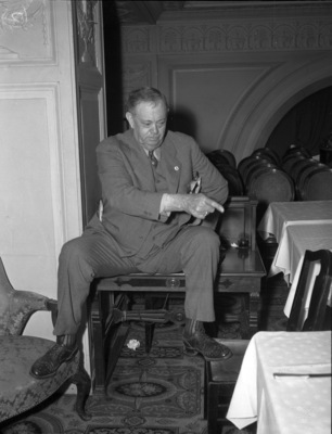 Among the Lumbermen's Association of Texas convention attendees was Jack Ray, of Waco, Texas. Mr. Ray is sitting on the edge of a table with his right foot rested on the edge of a chair and his left foot on a stool. He is pointing to something with his right hand. He is wearing a three-piece suit. Behind him are rows of chairs and a few tables. Mr. Ray has been elected to serve for life as the sergeant-at-arms of the state organization.