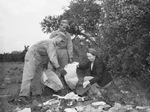 Camp Wolters in Mineral Wells, Texas is holding a drive to collect scrap metal. Hunting for scraps left to right are Private Victor Wilde, Private Lawrence Chapman, and Mrs. Bryant Caraway. The Privates are dressed in their military uniforms. They found the piece of scrap on Mrs. Caraway's farm. Mrs. Caraway is part of the Balch community in Parker County, Texas. She is wearing a scarf in her hair, blouse, blazer, and trousers, and looking through the metal scrap pile. Published in the Fort Worth Star-Telegram evening edition, October 30, 1942.