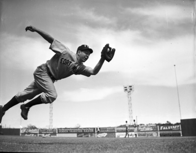 Irvine Jeffries, "The Flash" from Louisville, is still looking for a spot on the Fort Worth Cats roster. He is starting in the exhibition game against the St. Louis Cardinals. The veteran infielder is demonstrating the approved method of going after a line drive.