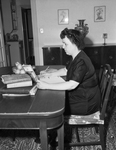 Mrs. William H. Beatty. Beatty is shown sitting at a table writing something down in a notebook. On the table she is working from there is a stack of books and a fruit bowl. In the background, there is a cabinet with two framed pictures hanging above it and a large vase set on top of it.