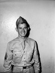 United States Army Staff Sergeant (Sgt.) William Paul Sweaney is shown standing against a bare wall, wearing a military uniform and smiling for the camera. He is visiting his mother Mrs. Eva Sweaney. Staff Sergeant (Sgt.) Sweaney now is stationed at Camp Wolters, will be sent soon to the Fort Benning, Georgia, Infantry Officers' Training School. Published in Fort Worth Star-Telegram evening edition, November 2, 1942.
