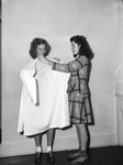 Rosemont Junior High School. Doris Anita Henry (left) and Doris Mae Ballew looking at hospital bed shirt. Miss Ballew is shown holding a hospital gown up for Miss Henry to inspect. Miss Ballew is wearing a matching checkered skirt and jacket ensemble.
