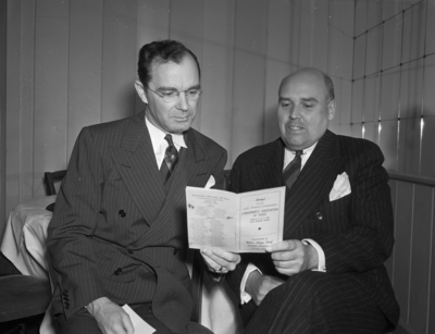 The Fort Worth Civic Music Association inaugurated it's tenth annual membership campaign with a dinner at Hotel Texas. Principal speaker was Sam J. Harrington of New York, representative of national headquarters, at right. H. Malvern Marks Junior, left, president of the association.