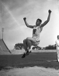 Billy Joe Rhodes of Fort Worth Technical High School won the city high school broad jump title with a leap of 19 feet 10 and a half inches. Shown here is one of his better leaps.
