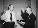 Federal Rent Control. Postmaster Henry Young (right) administering oath of office to Lucien Wright. The two men are shown standing in front of each other, as Young performs the oath for Wright. Both men have their right hands raised up and Young appears to be reading from a sheet of paper. Wright is wearing long-sleeve, striped shirt with a tie and Young is wearing a pair of eyeglasses and a dark suit. Behind them is a window.