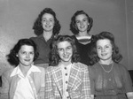 Our Lady of Victory College (OLVC) ) student body officers are pictured here. Front row, left to right, Zuma Burrow, Peggy Ellis and Leona Luke of Dawn, Texas. Back row, Joanna Lynch of Dallas, Texas, and Charlotte McDonald of Fort Worth, Texas. All five women are wearing dresses, facing front and smiling for the camera.