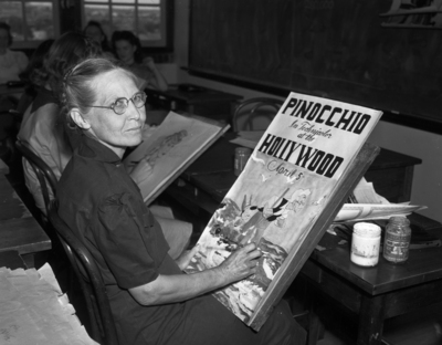 Mrs. A. J. Lang, 59, who has been a part-time student at Technical High School for two years, began retouching a poster with which she won first prize in a contest in which 16 of her fellow pupils participated.
