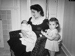Mrs. J. W. Jones, with her daughter, Cynthia Ann, 2, and infant son, J. W. Jones Junior. Mrs. Jones is shown sitting in a floral armchair cradling her son in one arm and holding her daughter with the other. Cynthia Ann stands next to the chair and looks on at the camera, while her mother smiles down at her younger brother. Mrs. Jones is wearing a long, dark dress with a lace collar and Cynthia Ann is wearing a small. short dress. Baby Jones Junior is swaddled in a blanket. Cynthia Ann is two years old and Jones Junior is almost a month old.