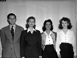 Texas Christian University's Dramatic Club will present an annual freshman-sophomore play contest Monday at 8:15 pm. in the college auditorium. Four members of the cast are pictured here. The group is shown standing against a bare wall, facing front and smiling for the camera. From left to right, are, F. L. Lucas, Mary Bell LeBus, Virginia Thaxton and Vida Bevil. Mr. Lucas is wearing a textured suit with a striped shirt underneath, Miss LeBus is wearing a jacket with three large buttons and a dark skirt, Miss Thaxton is wearing a long, dark skirt with a patterned, cropped jacket and Miss Bevil is wearing a long-sleeve blouse tucked into her skirt. The freshman production is titled "Utter Relaxation" and Mr. Lucas and Miss LeBus are performers. The sophomore will play "Model Behavior" and Miss Thaxton and Miss Bevil are performers. Published in Fort Worth Star-Telegram morning edition, November 5, 1942.