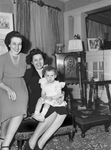 Mrs. A. Albert Fox (left) and Mrs. Julius Gilbert who is holding her grand daughter, Janelle Fox. The trio is shown sitting together in a living room with Mrs. Gilbert sitting in an armchair, Mrs. Fox sitting on one of the chair's arms and small Janelle sitting on her grandmother's lap. Mrs. Fox and Gilbert smile widely at the camera and appear in good spirits. Both are wearing similar dresses, however Mrs. Gilbert's dress is darker. Janelle is wearing a small frilly dress. Next to the chair is a small foot stool and a few other furniture pieces, including a lamp and a table. Mrs. Fox's husband, Lieutenant Fox, is stationed in Alberquerque, New Mexico with the Army Dental Corps and will be joined by his wife and daughter soon. Mrs. Fox was formerly known as Miss Jessonda Gilbert.