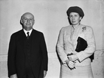 Volunteer File Cabinet Task Force. Mrs. J. F. Hemphill and Stanley Thompson. The duo is shown standing in front of an empty wall and looking into and the camera. Mr. Thompson is wearing a dark suit and Mrs. Hemphill is wearing a knitted jacket and a skirt with a beret. She is holding a pair of gloves in her hands and a clutch purse under her armpit.