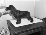 Dog. "Ronkenter's Black Knight," Cocker spaniel owned by Mr. and Mrs. Kenneth Miller. The dog won the sweepstakes at the puppy show of the Cocker Spaniel Specialty Club of Dallas, Texas. The dog is shown standing on a desk with drawers, with its head being touched by person off camera.