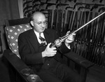 Doctor Samuel Jagoda, seated and inspecting a rifle. Behind him is a wall filled with mounted pistols and rifles that line the bottom of the wall.