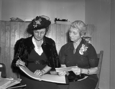 Among those attending the 30th and last annual session of the Central Texas Conference, Women's Missionary Society of the Methodist-Episcopal Church, South, were Mrs. B. B. Wedemere (left) of Waco, Texas, and Mrs. Gid J. Bryan of Cleburne, Texas. The two women are discussing conference papers as they sit and look over a small binder that Mrs. Wedemere has on her lap. Mrs. Bryan is holding a folded document. Mrs. Wedemere is wearing a long dress that has lace detailing and a belt. She also has on a fur coat and a decorated hat. Mrs. Bryan is wearing a short-sleeve knit dress that has floral detailing. The organization convened for two days at First Methodist Church in Weatherford, Texas. Mrs. Wedemere is the society's recording secretary. Mrs. Bryan is society president.