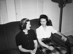 Mrs. Leon Moses and daughter, Billie. The mother and daughter are shown sitting on a couch, looking at each other and smiling widely. Mrs. Moses is wearing a dark, pleated dress with a brooch on the middle of her dress collar and Billie is wearing a checkered skirt with a short-sleeve blouse tucked into it. Billie also wears a ribbon in her hair. Mrs. Moses's husband is acting state attorney for the office of Price administration. Billie is 16 and a senior at Paschal High School. The family are former residents of Austin, Texas.