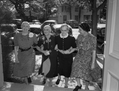 Among those attending the 30th and last annual session of the Central Texas Conference, Women's Missionary Society of the Methodist-Episcopal Church, South, were four former presidents of the society; (left to right) Mrs. Sam G. Thompson, of Fort Worth, Texas, Mrs. John W. Spivey, of Waco, Texas, Mrs. J. H. Stuart, of Arlington, Texas, and Mrs. W. B Landrum, of Tyler, Texas. They are wearing dresses of various patterns with an assortment of accessories. The four women are shown as they entered First Methodist Church in Weatherford, Texas, to attended the general conference. They are walking with their arms linked. Behind them are several cars parked on the road.
