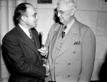 Baptist Convention. Left to right: R. A. Springer and E. S. Cummings. The two men are standing in front of each other, engaged in a conversation. Springer is wearing a dark, pinstriped suit and Cummings is wearing a lighter colored suit. Both men are wearing eyeglasses and Springer is also holding a notebook in his arms. Behind them is a tiled wall.