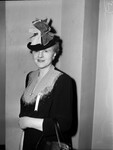 Baptist Convention. Mrs. R. L. Mathis. Mrs. Mathis is shown standing in front of an empty wall, smiling and holding her purse. She is wearing a dress that is dark with a lighter colored collar. There is also a small floral brooch at the middle of the collar. Pinned onto the dress is a small ribbon that reads. "Messenger". Mrs. Mathis is also wearing a hat adorned with a large bow.