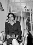Mrs. Milton Aldrich. Mrs. Aldrich is shown sitting on a striped armchair and reading from a magazine in her lap. She is wearing a small buttoned-up jacket and a skirt. Behind her is a window with open blinds. She recently moved to the area from San Diego, California with husband and their children, Tony and Stephen. Mrs. Aldrich is a member of the Alpha Omicron Pi Sorority.