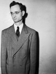 Dean Blanton, former Star-Telegram employee. Blanton is shown standing in front of an empty wall wearing a double breasted, striped suit and a pair of eyeglasses. Blanton, 33, is the son of Mrs. W. H. Blanton and has been at Star-Telegram for five years. He is to begin army training.