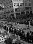 Armistice Day parade. Shots of 90th Division from Camp Barkeley shown in parade. Shown are 1,200 young men from the 90th Division marching down a large street. On either side of the street are a large line of people looking on. Parked cars and buildings can be seen.