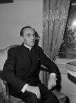 Reverend Thomas J. Taaffe, new pastor of Holy Name Catholic Parish. Taaffe is shown sitting in a chair next to a curtained window. He is dressed in a dark suit and is wearing a pair of eyeglasses. Next to his arm is a table with a large book set on top of it. Taaffe's mother, Mrs. Mary Taaffe and his brothers, John, Francis, and Patrick, all live in Ireland. His only sister, Sister Mary Benigus, lives in England.