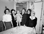Frank B. Stahl Junior, center. Others left to right: Mrs. Frank B. Stahl, Mrs. Edward H. Stahl of Kansas City; Mrs. A. Shurman, Mrs. V. R. Shurman and Mrs. S. A. Owens of Eastland, Texas. Frank Junior is shown standing on a table and being flanked by his mother, grandmothers and great-grandmothers. The grandmothers are shown happily looking on at small Frank while him and Mrs. Stahl look on at the camera and smile.
